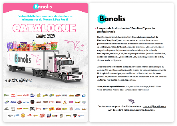 Accédez en un clic à plus de 1000 produits disponibles : snacks surprenants, boissons innovantes et incontournables de la « POP FOOD ». Notre catalogue en ligne est clair, simple et régulièrement enrichi de nouveautés pour vous offrir une offre toujours dynamique. Gagnez du temps, démarquez-vous et fidélisez vos clients avec BANOLIS.